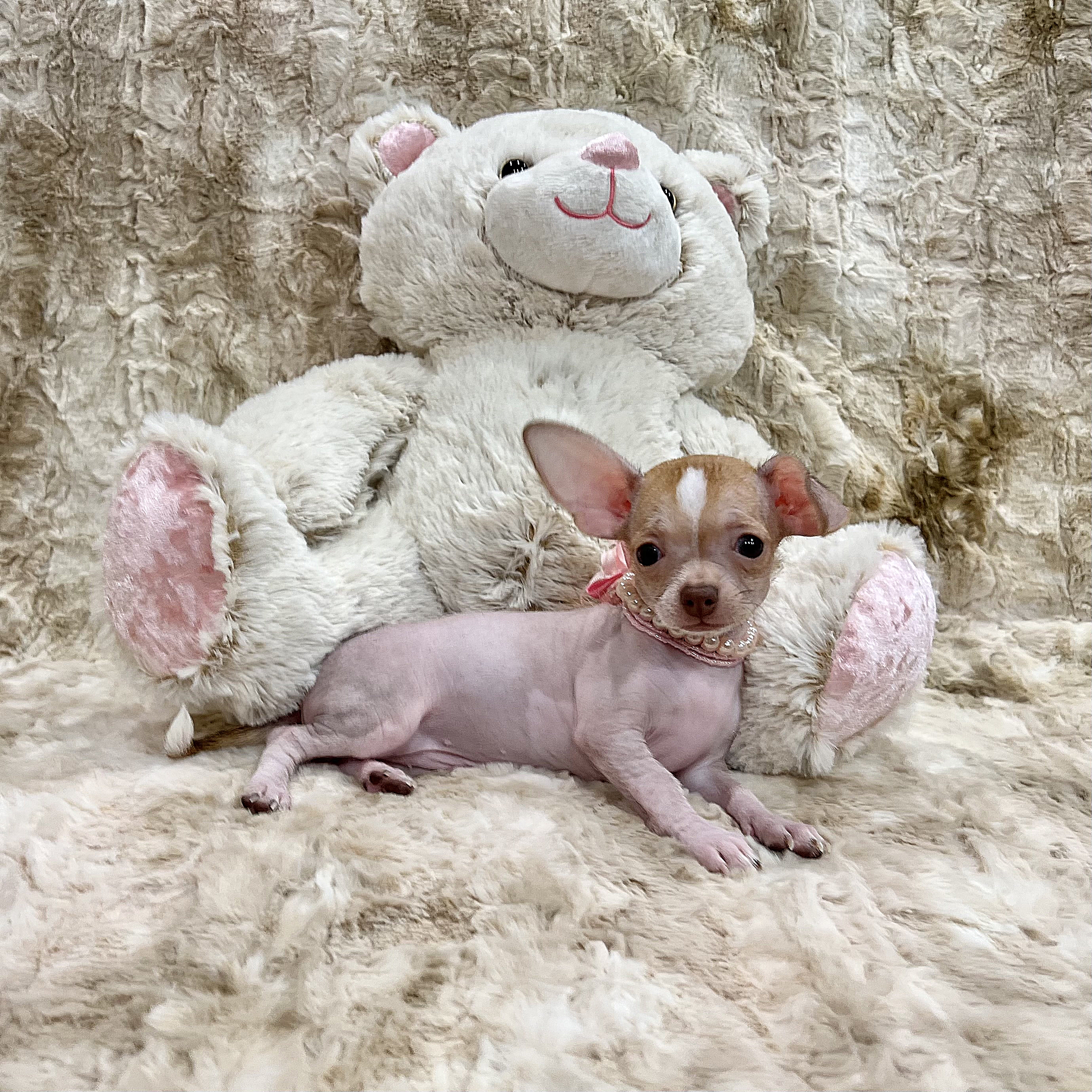 ON HOLD: Fawn and White Hairless Chihuahua/Xolo Girl This show-stopping little girl is charting to be aroud 6.5 pounds grown. These babies are 6th generation Chihuahua/Toy Xolo. Their personalities are absolutely amazing. Serious buyers only. Text for video. This baby is $650 with a local pick up near Rogers, Arkansas. We do not ship. We meet only at the location on our Meeting Location page. Please text between 9:00 a.m. and 6:00 p.m. CST. We are available by appointment only. Please read all information on our website prior to texting; it answers many commonly asked questions. |